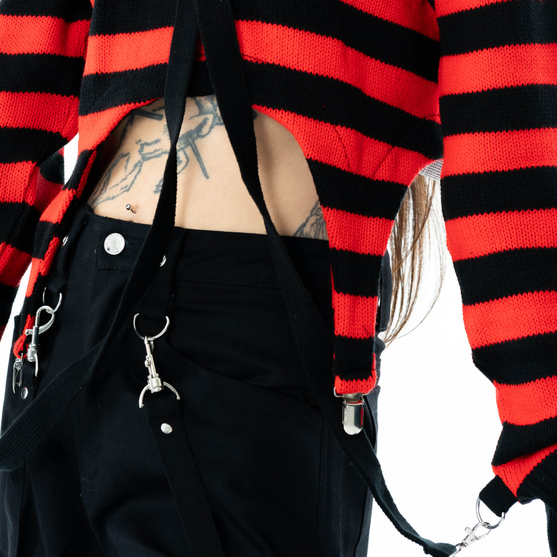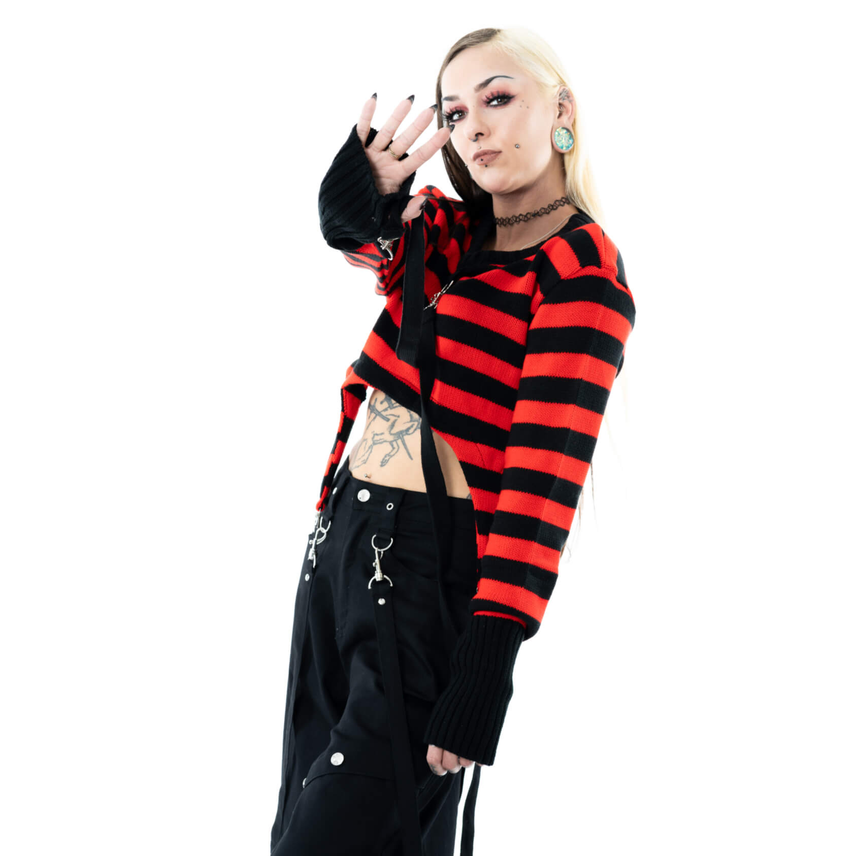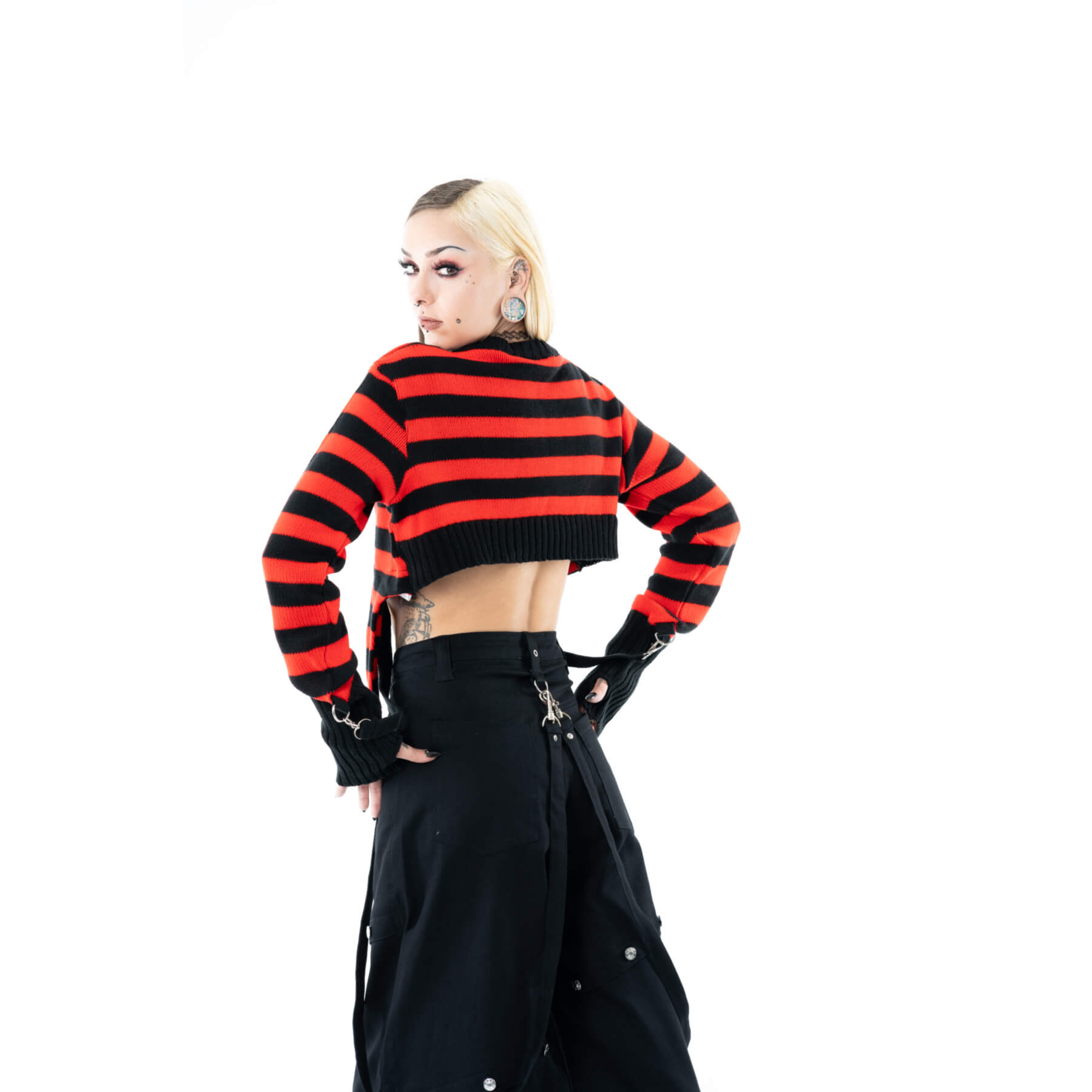 This soft, light weight jumper in red and black stripes with strapped edges has to be one of the coolest things you could put in your wardrobe this winter.